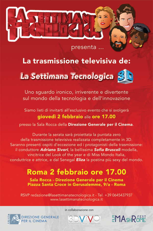 Giovedì 2 febbraio, alle 17.00, presso la Sala Rocca della direzione generale per il Cinema, presentazione di La settimana tecnologica, trasmissione televisiva in 3D sul mondo della tecnologia e dell'innovazione.