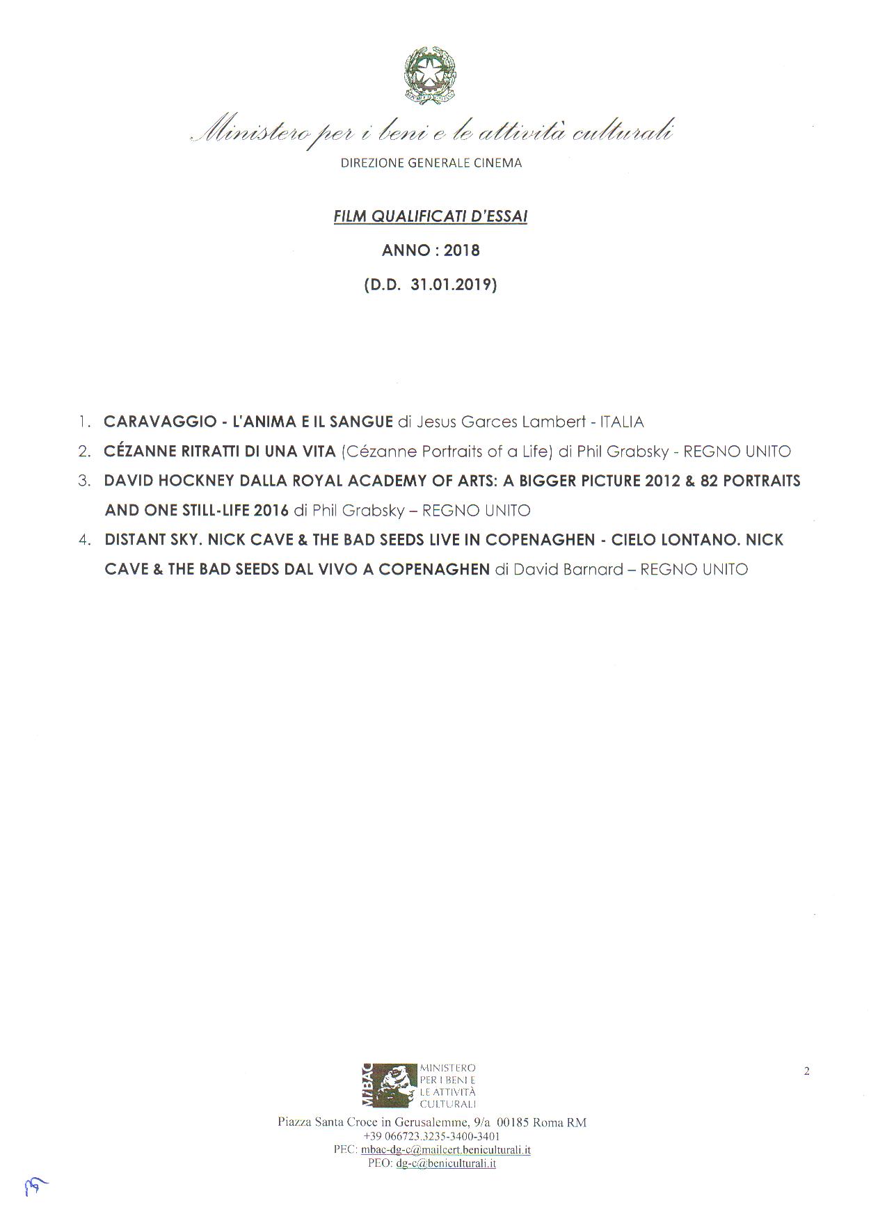 NUOVI FILM QUALIFICATI D’ESSAI CON DECRETO DIRETTORIALE DEL 31 GENNAIO 2019